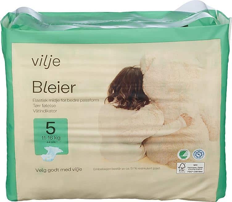 Alle Vilje bleier er utviklet med en ekstra absorberende kjerne med kanal- og SeconDRY® teknologi som gir bedre oppsugningsevne og ekstra tørr følelse. Myke lekkasjesperrer langs bena hindrer effektivt lekkasjer og den elastiske midjen gir fleksible passform. I tillegg har bleiene en praktisk våtindikator foran på bleien som skifter farge når bleien bør skiftes. Bleiene er dermatologisk testet, godkjent av miljømerket Svanen og anbefales av Astma Allergy Nordic.