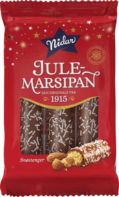 Marsipanstenger fra Nidar dekket med deilig melkesjokolade og strøssel. Passer perfekt til når man ønsker å unne seg selv noe ekstra godt. Sjokoladen er laget med kakao fra Rainforest Alliance-sertifiserte gårder.